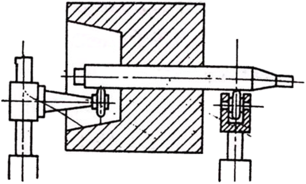 那么我們?cè)诳紤]上述事項(xiàng)的基礎(chǔ)上,先要選擇適合各轉(zhuǎn)子的通用平衡機(jī),那么對(duì)于標(biāo)準(zhǔn)型通用平衡機(jī)不適用的轉(zhuǎn)子來(lái)講,大部份的情況是,或者在通用型的平衡機(jī)上附件,或僅做局部改動(dòng)使用通用平衡機(jī)。如圖所示的轉(zhuǎn)子,如果不加處理的話(huà),就沒(méi)辦法裝在通用平衡機(jī)上,如果準(zhǔn)備好特殊懸臂滾子支承,那么這樣的問(wèn)題就能解決了,與此相同的例子為數(shù)不少。