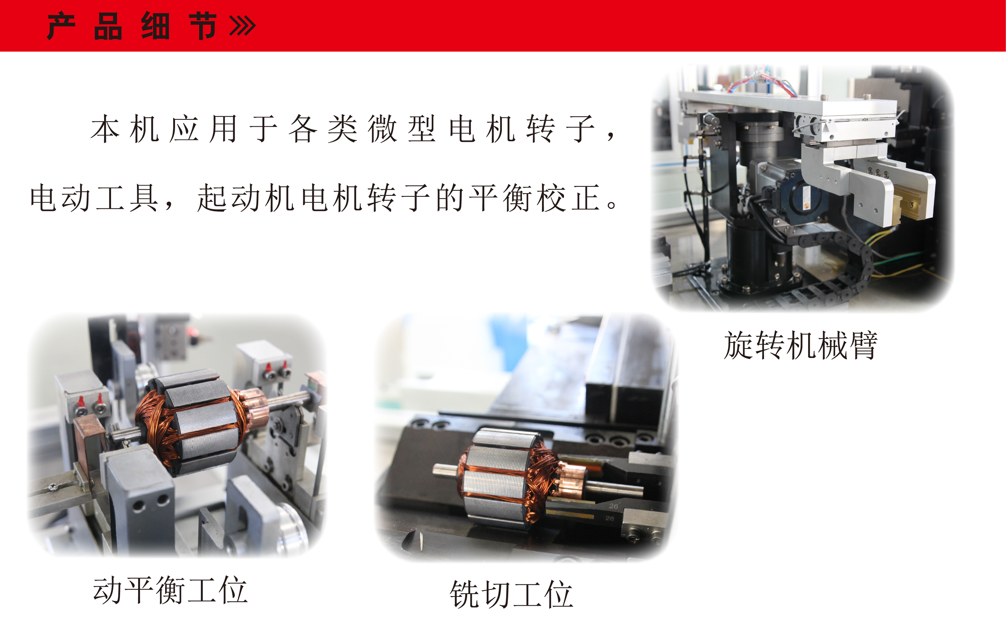 應用于各類微型電機轉(zhuǎn)子,電動工具,起動機電機轉(zhuǎn)子等繞線轉(zhuǎn)子的平衡校正。